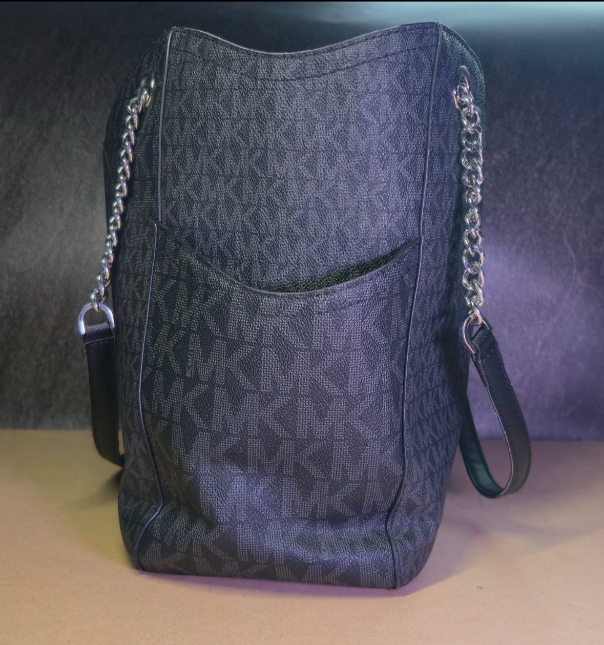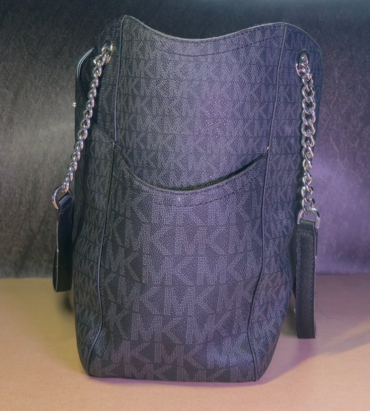In Good used condition. The architectural shape features convenient side pockets and a secure top-zip fastening. Black bag with Silver-tone hardware, Size: 15.5”W X 9.75”H X 5”D. Handle drop: 10”, Interior details: back zip pocket, Lining: 100% polyester, Zip fastening. Dust bag not included. Some wear in the handles from everyday use but otherwise in great condition.